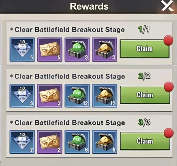 Players get various rewards after clearing the stages of Battlefield Breakout depending on their ranks. Rewards include diamonds, hero shards, a large number of gems for leaderboard rewards, and gears. With different rank various rewards are given.