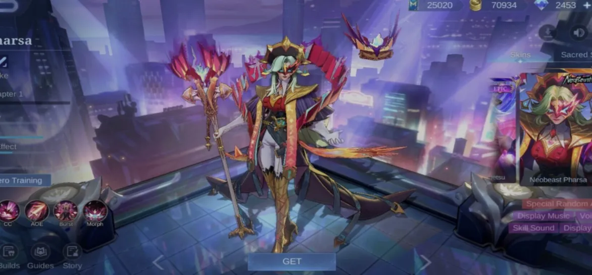 Neobeast Pharsa is completely a mommy skin that gives the vibe of a cyber-queen with a mystic cloak lit up in electric hues and bright purple. Her wings shift colors, creating stunning visual effects and elevating her whole aesthetic.
